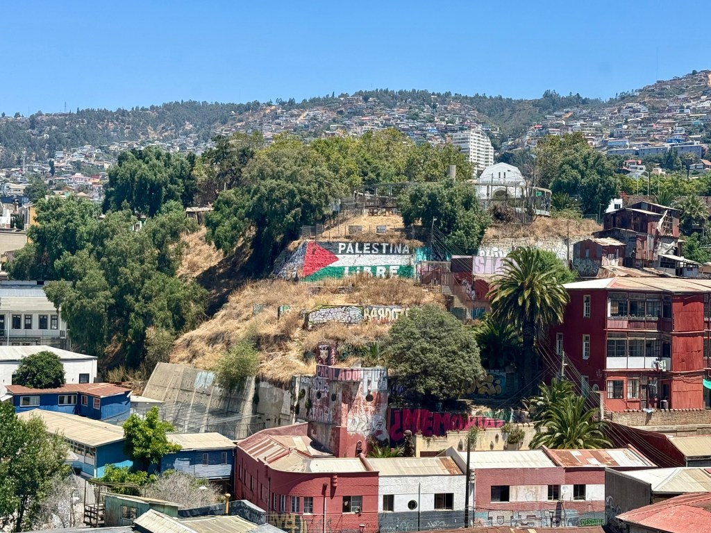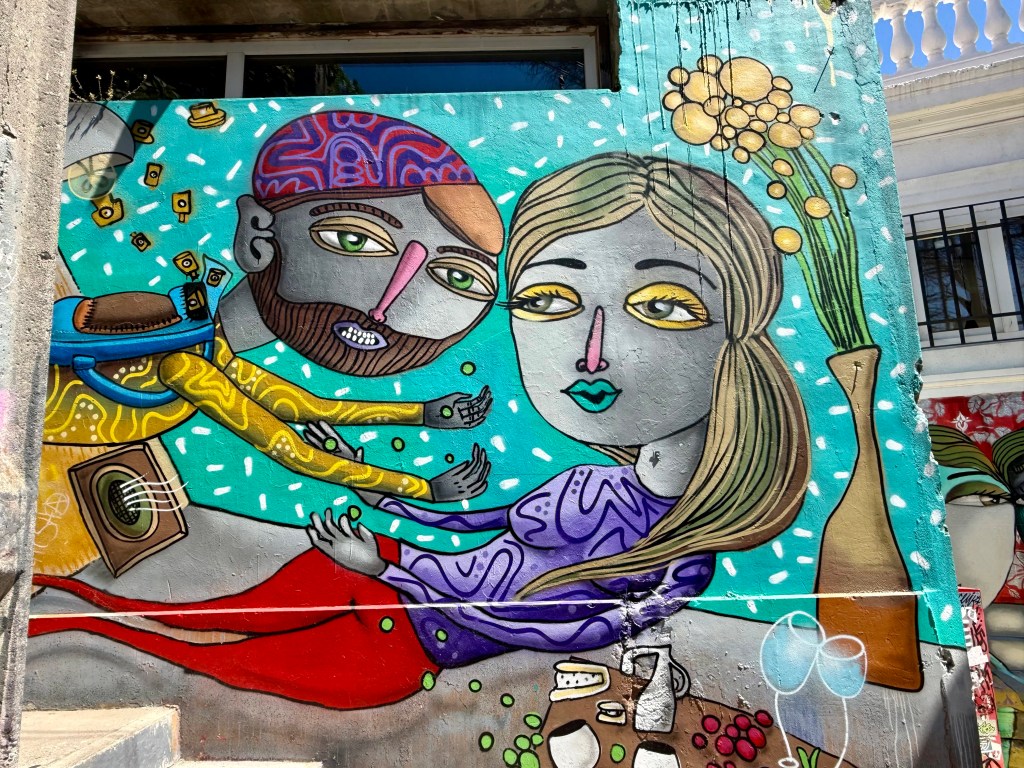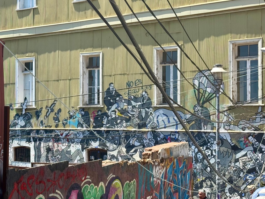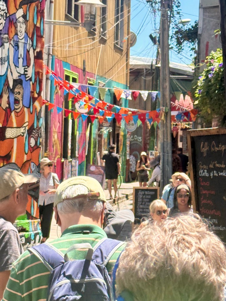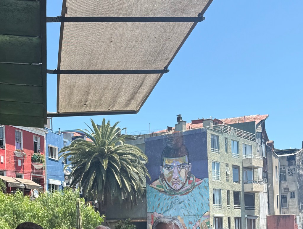 Our first day in Chile started after a very short night’s sleep. Jet lag and not enough sleep kept us fairly exhausted for the next week our so. Dinner is eaten late in South American and touring days start early. After a morning lecture about the history of agriculture and winemaking in Chile, we were heading to Valparaiso for the day to visit the historic city center which is now a UNESCO World Heritage Site. A funicular ride took us up the hill to the old city where a warren of streets and cobblestone alleyways greeted us. There was street art everywhere and I was in my happy place.